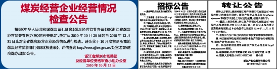 根据《中华人民共和国煤炭法》、国家《煤炭经营监管办法》和《浙江省煤炭经营监督管理办法》的有关规定,决定从2010年10月20日起至2010年12月31日止对全省煤炭经营企业经营情况进行检查。请企业于10月底前到所在地煤炭经营监管部门领取《检查表》。详情查询http://www.zjjxw.gov.cn/处室之窗/建冶煤办/通知公告。