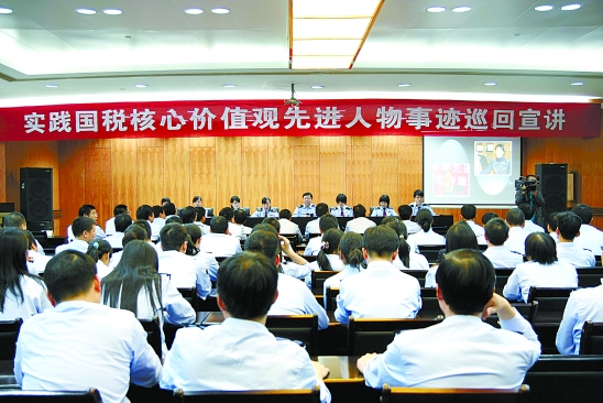 | 近日,绍兴市国税系统“实践国税核心价值观”先进人物事迹宣讲团来到各县(市)局进行宣讲。宣讲团成员从不同角度、不同侧面生动地介绍了叶月娥等六位同志立足本职、无私奉献的先进事迹。图为绍兴县国税干部职工在聆听演讲。 何华明/文 陈翔/摄 |