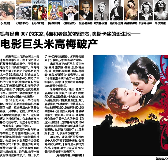 好莱坞五大电影公司之一的米高梅电影公司,由于无力偿还巨额债务和推出新作,于美国当地时间3日晨宣布破产。米高梅曾经拍摄了电影史上最出色影片之一的《乱世佳人》,创造出历久不衰的银幕经典《007》,塑造了不朽的卡通形象《猫和老鼠》,发起成立了美国电影艺术与科学学院,并推出了学院奖,也就是奥斯卡奖。这样的一家老牌实力电影公司如何会走到破产的境地?