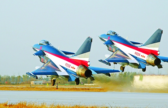 11月2日,八一飞行表演队新涂装的歼-10战机双机起飞进行训练。新华社发