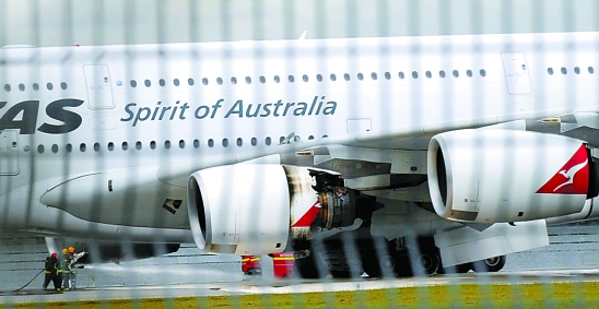 11月4日,在新加坡樟宜机场,消防员向迫降的澳洲航空公司空客A380客机受损引擎喷洒灭火泡沫。 新华社发