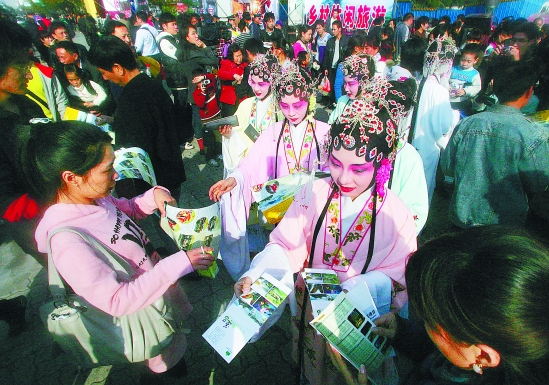 | 12月5日,在杭州吴山广场,几名打扮成昆曲《牡丹亭》中“杜丽娘”的演员,向杭州市民派发各种遂昌旅游资料,并通过昆曲表演,将遂昌浑然天成的山水、厚重深远的文化展示给杭州市民,邀请杭州市民到遂昌走一走,看一看,体验“健康、快乐、休闲”的梦想之旅。本报记者 林云龙 摄 |