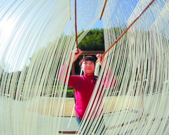 12月5日,诸暨市马剑镇龙门村村民在晒手工面。一根根细细长长的面已成为村民一个新的“经济增长点”。马剑镇手工面渊源