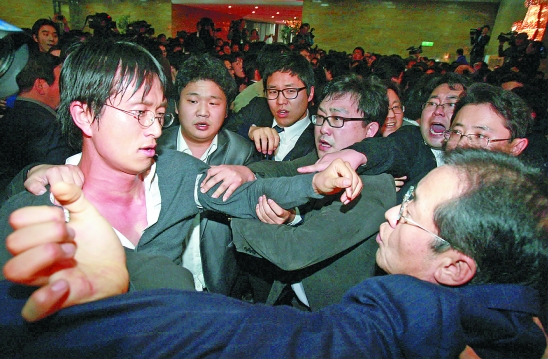 12月8日,在韩国首尔,国会议员们在国会会场内大打出手。当日,韩国国会民主党议员试图阻止执政党议员在议会通过预算案,双方发生肢体冲突。 新华社发