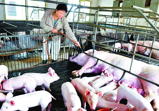 浙江许多养殖场建起了生态循环养殖系统,图为一家猪场的饲养员给猪舍清洗降温。通讯员 张建成 摄