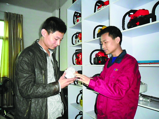 姜晓峰(左)和技术人员交流工作。陈洪标 摄