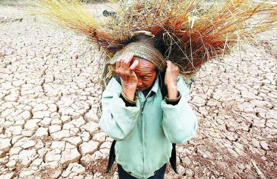 3月28日,云南省楚雄自治州南华县雨露乡干渴的罗文村。面临绝收,村民只好把枯死的庄稼和杂草一起用做牲畜饲料。