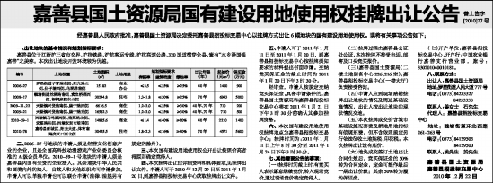 六、本次国有建设用地使用权挂牌地点为嘉善县招投标交易中心;挂牌时间为:2011年1月11日上午8时30分至2011年1月24日下午3时30分。