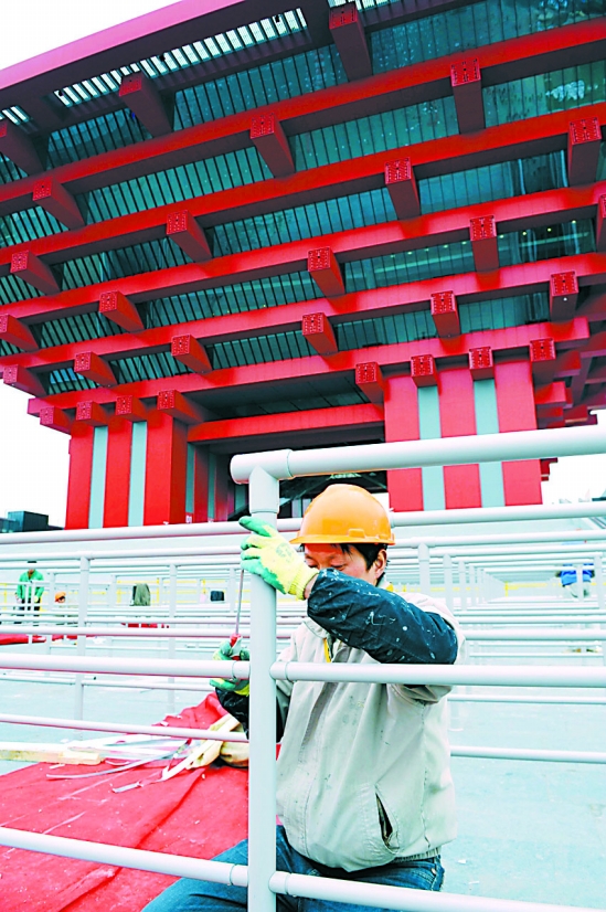4月9日,一位工人正在安装护栏,他成了最早和中国馆合影的人。