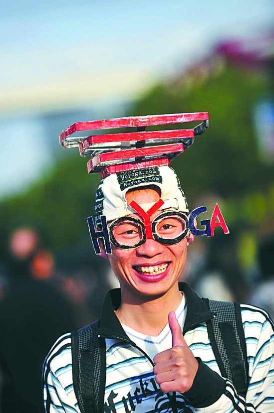 10月31日,上海世博会最后一天。一游客带着自制的中国馆“头盔”畅游世博园。