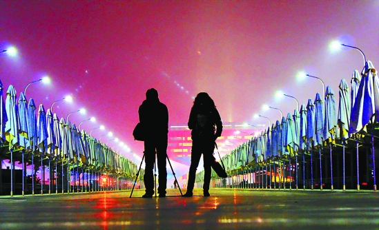10月31日晚,上海世博园区内的游客拍摄中国馆。