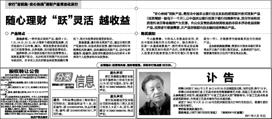 “安心快线”理财产品,是指由中国农业银行自主发起的超短期开放式理财产品(投资周期一般低于一个月),以中国农业银行投资于银行间债券市场、货币市场和优质信托项目等金融资产为支撑,向公众发售的具有较高收益的非保本浮动收益理财产品,投资者可根据需要,在产品存续期内自主赎回或申购此产品。