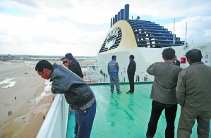 | 2月26日,在希腊客轮“希腊精神”号上,中国撤离人员在甲板上散步。新华社记者 于洋 摄 |
