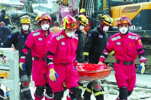 | 2月26日,在新西兰克赖斯特彻奇市,中国救援队队员在坎特伯雷电视大楼废墟找出一具遇难者遗体。 新华社发(王满达 摄) |