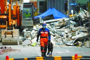 | 一名日本搜救队员牵着搜救犬从地震废墟前走过。 新华社发 |