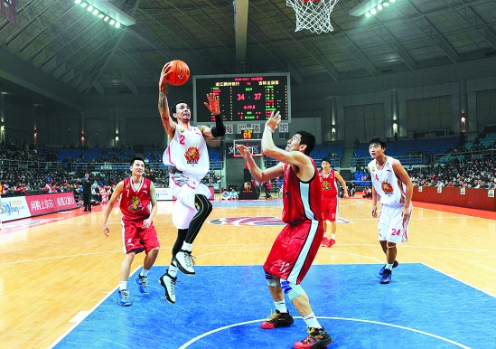 稠州银行男篮外援威廉姆斯在上篮。陈熙春 潘良干 摄