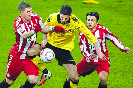 多特蒙德前锋莱万多夫斯基(中)在突破。 东方IC供图