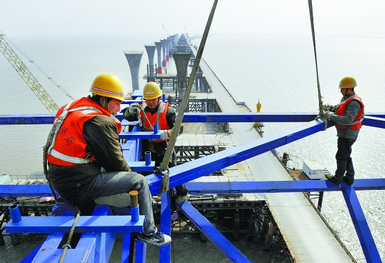作为我省大项目之一的嘉绍跨海大桥,正在紧张施工中。 CFP供图