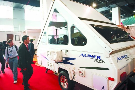 3月13日,在杭州市和平国际会展中心,人们被能移动的房屋吸引,在售价为十几万元的“两室一厅”中,冰箱、空调、餐桌、床以及厨房用品一应俱全,俨然一个移动的家。图为可折叠的房车。记者 杨晓轩 摄