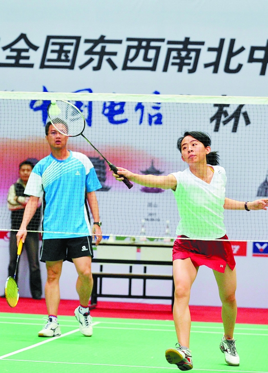 全国东西南北中羽毛球大赛首站杭州站比赛13日在杭州黄龙体育中心结束。图为运动员在比赛中。陈熙春 摄