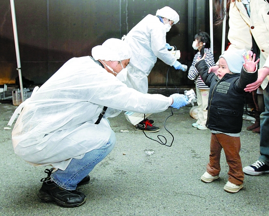 3月13日,在日本郡山的一个紧急避难所,身着防护服的工作人员检查从福岛第二核电站附近撤离的民众是否遭辐射影响。 新华社发