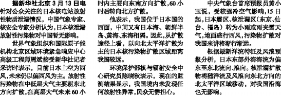 据新华社北京3月13日电 针对公众关注的日本核电站放射性物质泄漏情况,中国气象专家、核安全专家分析认为,日本核泄漏放射性污染物对中国暂无影响。