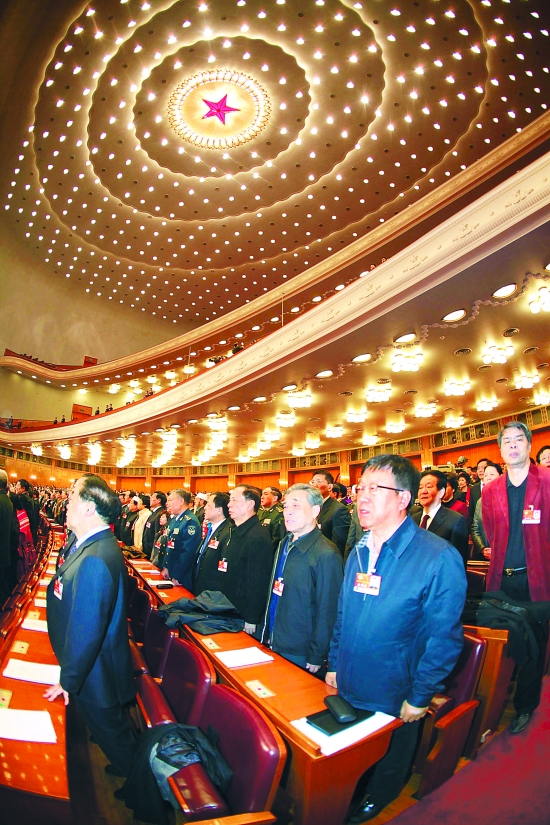 3月13日,中国人民政治协商会议第十一届全国委员会第四次会议在北京人民大会堂举行闭幕会。这是全国政协委员高唱国歌。 新华社记者 李刚 摄