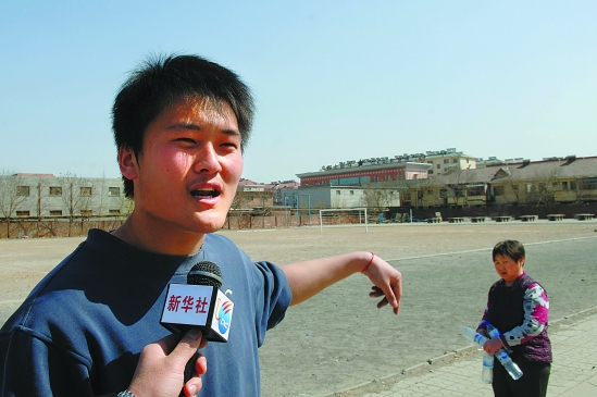3月25日,在德州学院南校区操场,一位目击者向新华社记者讲述3月19日发生的男子驾驶直升飞机接走该校女生的事情。 新华社记者 郭绪雷 摄