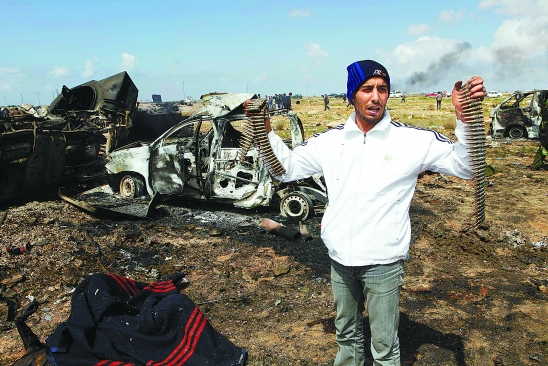 在班加西郊外,一名男子站在遭空袭后被烧焦的利比亚政府军车辆边。