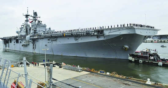 3月23日,美国向地中海增派两栖作战舰队参与针对利比亚的军事行动。图为“巴丹岛”号两栖攻击舰驶离美国弗吉尼亚州诺福克海军基地。