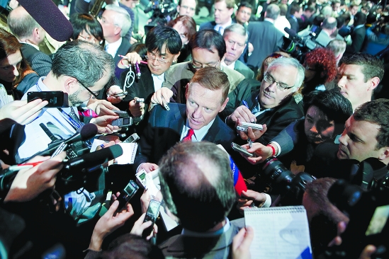 图为福特总裁艾伦·穆拉利被记者追问。福特出售沃尔沃的细节仍然是公众感兴趣的话题。CFP供图