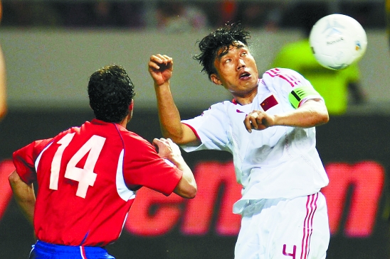 中国队队员郑智(右)与哥斯达黎加队队员奥维多在比赛中拼抢。新华社发