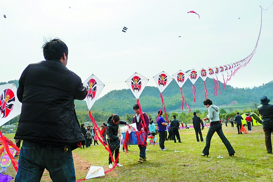 昨天,48支风筝队的100多名队员,齐聚绍兴市富盛镇,参加风筝放飞表演赛,图为长2008米的京剧脸谱风筝博得阵阵喝彩。 绍兴县报记者 高洁 摄