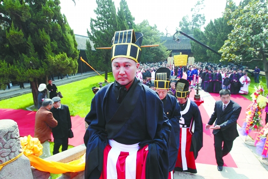 | 3月27日,孔子第78代直系后裔、世界孔子后裔联谊总会副会长孔众(前)参加祭祖大典并担任主祭。当日,海内外近300名孔子后裔共同参与了在上海嘉定孔庙举办的“辛卯年上海孔子后裔清明祭祖大典”,中外近百名嘉宾一同见证了典礼全过程。此次较高规格的孔氏家祭活动,在上海尚属首次。 新华社记者 任珑 摄 |