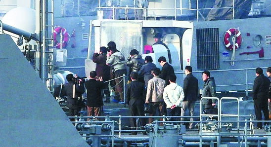 3月27日,朝鲜渔民在韩国仁川登上韩国海军舰艇,准备返回朝方一侧。