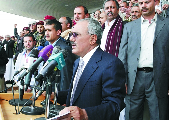 3月25日,也门总统萨利赫(前)在首都萨那发表讲话说,他已经准备好将政权和平移交给可靠的人,但不会交给少数企图制造混乱的人。新华社发