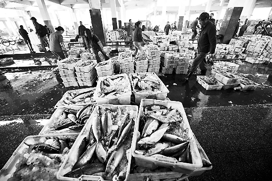 松门水产品批发市场,渔民们正在整理海鲜。该市场年交易量20万吨以上,交易额10多亿元。通过市场的辐射,温岭生产的水产品畅销全国各地。