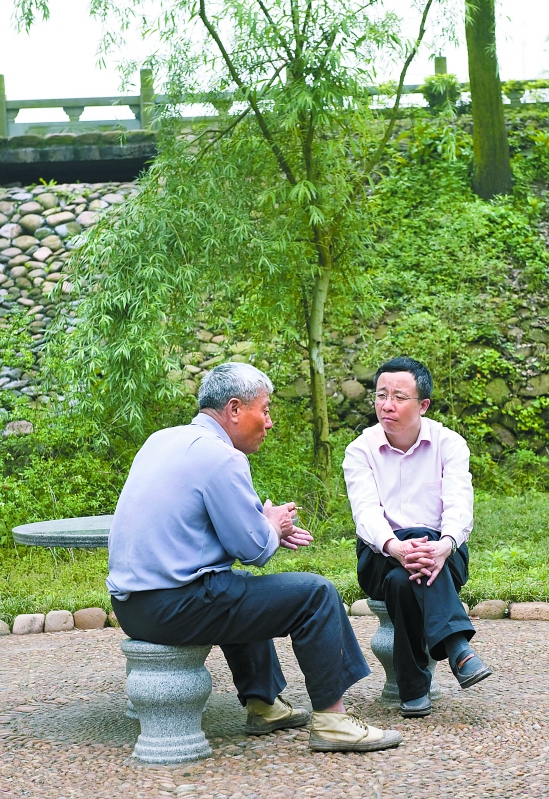 傅根友(右)和村民促膝长谈。