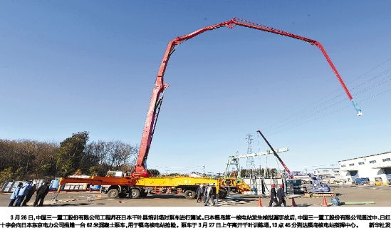 | 3月26日,中国三一重工股份有限公司工程师在日本千叶县培训场对泵车进行测试。日本福岛第一核电站发生核泄漏事故后,中国三一重工股份有限公司通过中、日红十字会向日本东京电力公司捐赠一台62米混凝土泵车,用于福岛核电站抢险。泵车于3月27日上午离开千叶训练场,13点45分到达福岛核电站指挥中心。新华社发 |