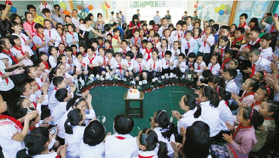 5月29日,温州市少先队队长学校的学员与育才小学的小朋友一起欢度节日。 卢春雨 摄