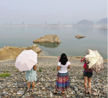 三峡水库已为下游补水180多亿立方米。图为5月27日,游客在观看水位下降后的三峡大坝。