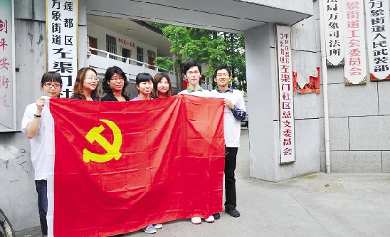 在丽水莲都区万象街道左渠门社区交流红色寻访经历后,丽水小分队成员在党旗前合影。陈翔 摄