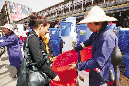 昨天,舟山市民正在定海区东海西路一家杂货店选购水桶。持续干旱,舟山市下月起将实行定时供水,众多市民闻讯后纷纷上街购买水桶储水,使原来少有人问津的水桶成了抢手货。 舟山日报记者 胡社友 摄