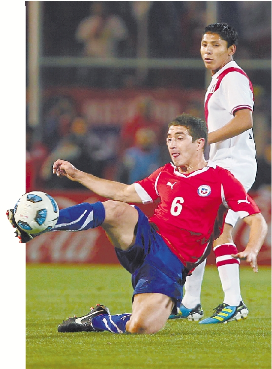 7月12日,智利队球员卡洛斯·卡尔莫纳(前)在比赛中拼抢。当日,智利队在美洲杯C组小组赛中以1比0战胜秘鲁队。从而以小组第一的身份晋级八强。 新华社发