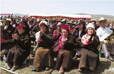 四川阿坝州红原县群众正在参加“阿坝州扶贫开发和综合防治大骨节病”试点启动仪式(2008年5月6日摄)。 新华社发