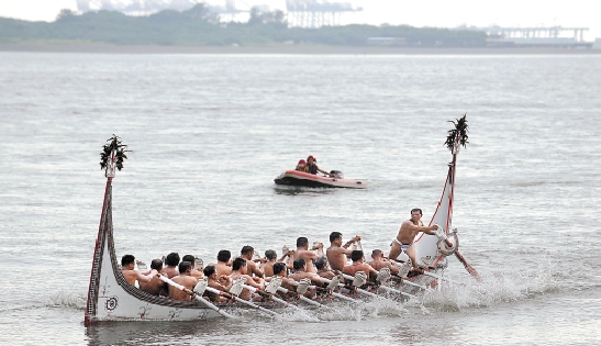| 7月13日,雅美勇士划着传统拼板舟“拜访号”,抵达台湾新北市淡水区老街河堤码头。6月29日,40名雅美人从台湾东部离岛兰屿乡东清部落出发,分为两班,划着传统拼板舟“拜访号”,劈风斩浪,于7月13日抵达台湾北部新北市淡水区,以展现雅美勇士的大无畏精神和独特的海洋文化。 新华社发 |