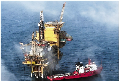 记者乘坐直升飞机拍摄的蓬莱19-3油田溢油事故C平台(7月11日摄)。 新华社记者 郭绪雷 摄
