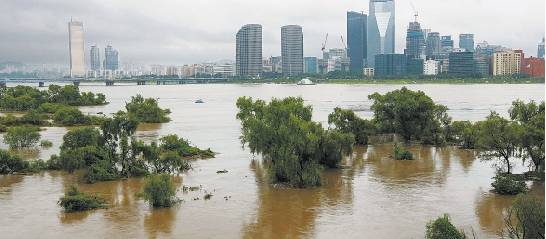 7月28日,位于韩国首都首尔奥林匹克大道附近汉江中的河中岛——栗岛在暴雨中淹没。