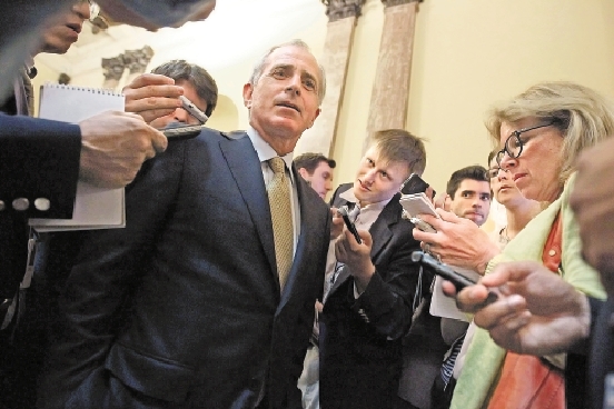 美国两党关于债务上限的争吵引发了整个世界的关注与忧虑。图为参与谈判的参议员鲍勃·科克被记者“围堵”。 新华社发