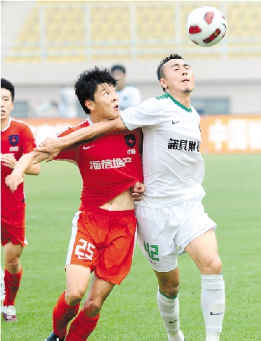杭州绿城队球员毛剑卿(右)与青岛队队员在拼抢。 新华社发